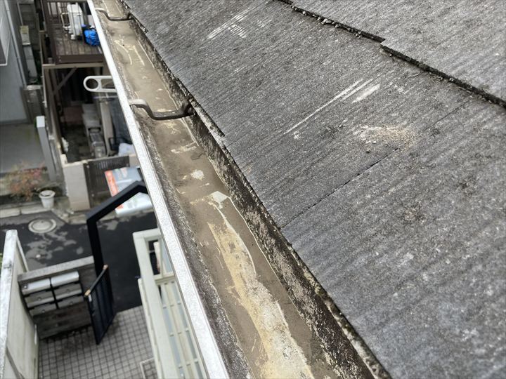 雨水を集める排水口回りが劣化していると、大量の雨漏りに繋がってしまいます。排水管と金物の取り合いにも隙間が空いているのが確認出来ました。
