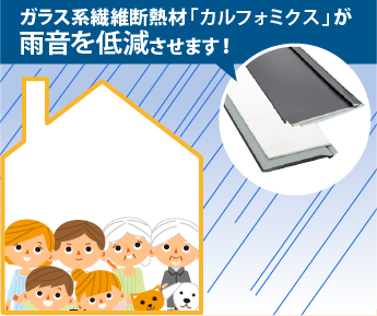 金属屋根は雨音がうるさいは過去のこと、スーパーヒランビーきわみは従来の金属屋根特有の雨音を低減します。過去、金属屋根が避けられ続けた理由の一つとして雨音の大きさがありました。現在の金属屋根はほとんどがその対策をされたものです。スーパーヒランビーきわみは遮音性を持つガラス系繊維断熱材「カルフォミクス」が雨音を低減させます。※それでも音が気になる方は、『サウンドプルーフ』という制震・断熱シートもあります。