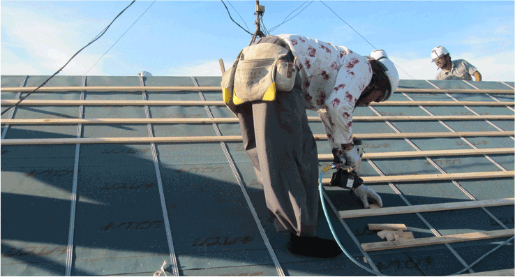 現在の工法では土を使わず、瓦桟木を取り付け、その上に瓦を設置します。土を使わないので屋根の総重量を約3分の2から2分の1程度まで減らすことが可能です。これによって耐震性も向上します。まずは新しい防水紙を敷設し、その上に瓦桟木を一定の隔で取り付けていきます。