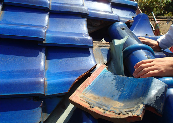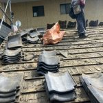 まずは瓦を外します。漆喰なども剥がして撤去していきます。外した瓦は再び使用するので、割れたりしないように慎重に扱います。きちんと整理して保管します。