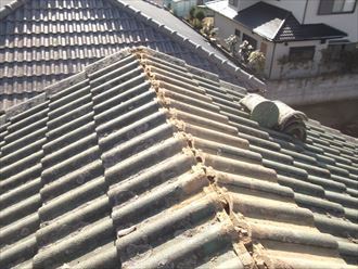 狛江市のお客様より屋根の調査をしてほしいとの事でお問い合わせをいただき調査にお伺いいたしました。屋根は瓦で築20年経過し1度も点検やメンテナンスをしてない為、心配になりご相談のお問い合わせいただきました。棟瓦全体の漆喰に割れや欠損が出ており、棟瓦を固定する釘が浮いてしまっている状態です。棟瓦にズレは出ていませんでしたが、漆喰の劣化や釘浮きの影響から棟瓦が崩れてしまった場合、雨漏りが発生する恐れや瓦が落下し二次災害が起きる危険性がありますので棟瓦の工事が必要な状況です。工事として、漆喰の劣化・釘浮きの状況から棟瓦を新しく作り直す棟取り直しをご提案し工事のご依頼をいただきました。
