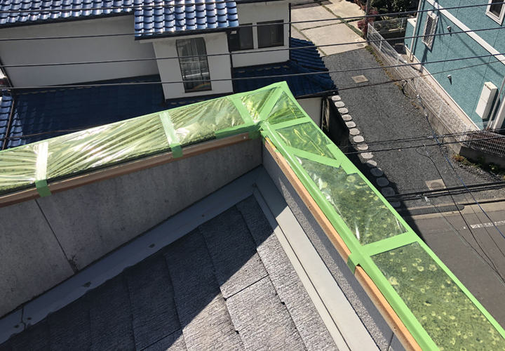 調査の結果、屋根は勾配のあるスレート屋根で、立ち上がり(パラペット)部分が笠木で覆われた構造でした。