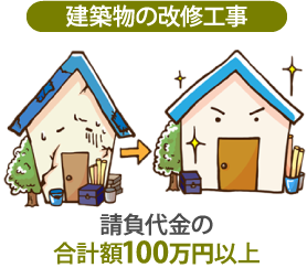 ②:建築物を改造し、又は補修する作業を伴う建設工事であって、当該作業の請負代金の合計額が100万円以上であるもの