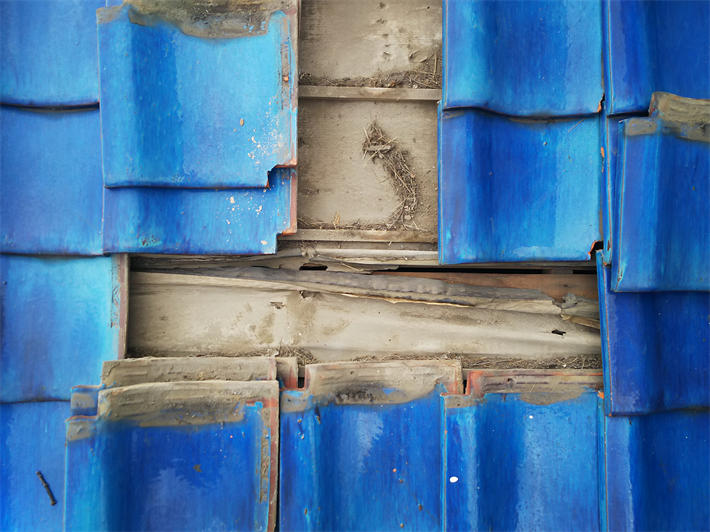 屋根の調査の様子です。梯子を使い屋根に上がり、調査を行った小屋裏上部の瓦を捲ると防水紙が捲れており、バラ板が露出しているのを発見しました。