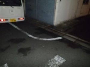 一方通行の道で、道幅は足場のトラックを置いても確保できそうです。曲がり角からの距離やご近隣様のガレージなどとの距離も突っ込まれますので計測しておきます。