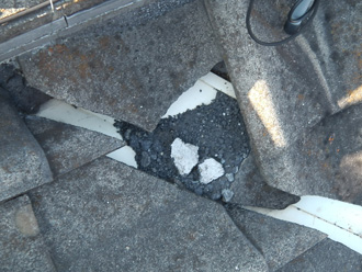 谷部の瓦が割れていました(右写真)。このような箇所から雨水が侵入して雨漏りするので、こちらの補修も必須です。