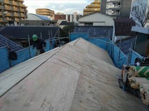 清掃の終わった屋根面に針葉樹合板を増し張りします。既存の野地板は杉皮のトントンとごく薄いベニヤ板の為、撤去はせずに増し張りを行います。