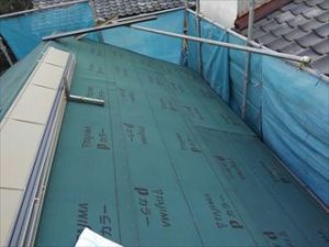 野地板が増し張りになったら屋根面はシッカリとするので、屋根葺き替えに使用する材料を荷揚げいたします。ルーフィングを野地板に貼って軒先に新たな屋根材を葺くための役物金具を取り付けします。