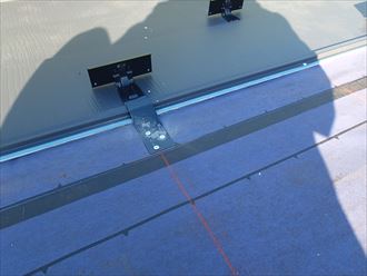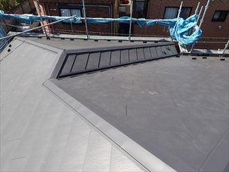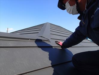 屋根全体を見回してタッチアップの必要箇所やシール処理の状態を最終的に確認してまわります。もちろん棟板金の固定はステンレスビスで行っています。耐候性能の非常に高いガルテクトフッ素でカバー工事を行いましたのでかなりの長期間屋根に関しては何の心配もないでしょう。継ぎ目のシール部分は定期的に確認をしながら今後も末永いお付き合いを宜しくお願い致します。