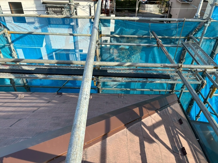 塗装色とは合いませんが黒の棟板金でおさめました。継ぎ目にシールを行い大屋根は交換完了です。