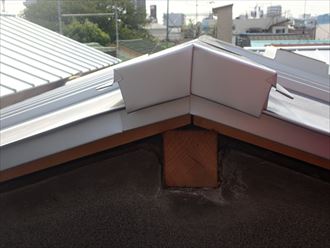 嵌合式は山と山を嵌(は)め込む構造になっております。屋根面にボルトがまったく出ないスッキリした仕上がりになります。貫板付近では屋根材を折って棟を被せてあげないと横殴りの雨の際入り込んでしまう可能性がある為しっかり採寸して折りまげます。