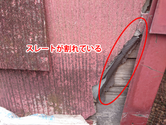 左写真はスレートが割れているところです。スレートの下には防水紙が設置されているのですが、それも剥がれて野地板が丸見えになっています。おそらく雨が降ればここから浸水してしまっているので内部の傷みも気になります。