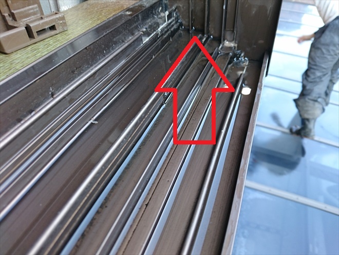 今回の多摩市諏訪で雨漏りしている建物の原因箇所は、雨漏りした部屋の真上に取り付けてあるアルミサッシです。サッシの枠の外側からの浸入ではなく、枠の内側が原因になっていました。矢印の部分が雨漏りの原因で、ここから壁の中に入りこんで真下にあるサッシから雨漏りとして現れていました。アルミサッシはタテと横のフレームをパッキンを挟み込んで固定してあります。しかし、経年劣化によってパッキンの止水性が無くなってしまい、雨水が入り込みます。サッシのレール部分にはある程度雨水が溜まる様になっており、ちょっとした水溜りの様になってしまうので、小さな隙間から毛細管現象の様に吸い込む力が働いてしまいます。矢印の部分が外壁の外側に出ていれば雨漏りになる事はありませんが、根本的な原因を直すには、パッキンを交換しなければなりません。その作業にはサッシを一旦外さなければならず、外壁も一部剥がすなど大掛かりな工事が必要になります。今回の雨漏り修理工事はシール材での仮補修となりましたので暫くは雨漏りする事はありませんが、次に雨漏りした時にはサッシの改修工事が必要になります。雨漏りは見えない所で建物を腐食させてしまいますので、しっかりと原因を特定して適切な工事をおこないましよう。