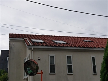 下から屋根を見ると何かが捲れているのが見えるという事でお問合せをいただきました。調査に伺うと瓦葺きの屋根にはトップライト(天窓)が取り付けてあるのですが、トップライトの下部分が捲れていました。トップライトは屋根に穴を開けて取り付けますので、雨水が入り込まない様に水切りを取り付けてあります。瓦の場合は雨水を瓦の上に流す様にするために蛇腹状になったエプロンが水切りと一体になって取り付けてあります。