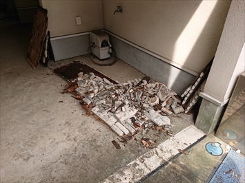 鉄骨製の骨組みにべニアを張ってからタイルが張ってありますが、下地が腐っていましたのでタイルの重さによって一気に落ちていました。他の部分も落ちてしまう可能性がありますので、重いたるではなくなるべく軽い物への張り替え工事をご希望されています。