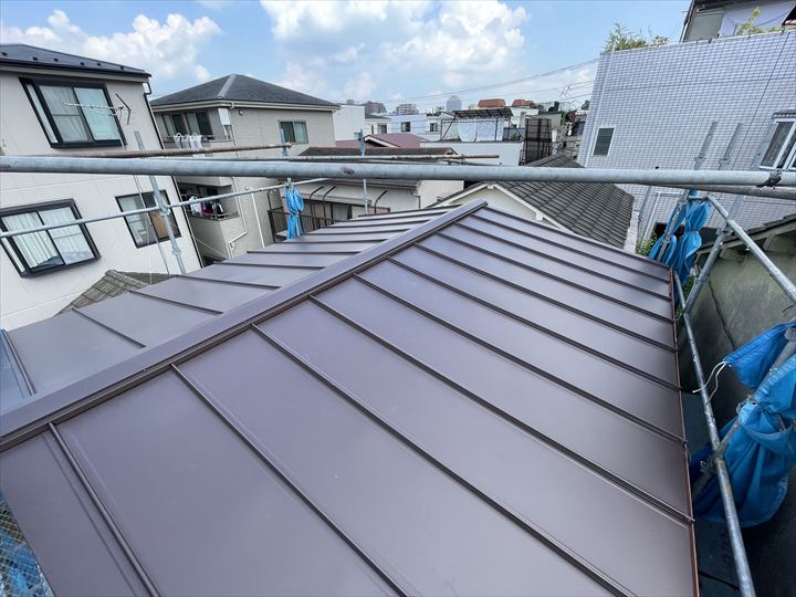 - アールロック(ブラウン)を使用!豊島区上池袋にて台風により捲れてしまった瓦棒葺き屋根の葺き替え工事を実施