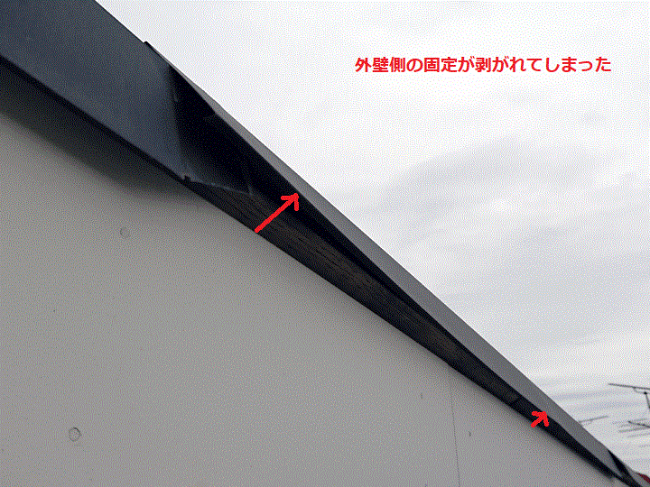 屋根の形状は、近年人気のある片流れの形状でした。棟板金の固定が外れてしまっています。下から見ると内部が見えている状態でした。このまま放置してしまうと、強風などが吹き込んだ場合、棟板金が剥がれてしまったり、剥がれた部分に雨が吹き込んでしまう恐れもあります。できるだけ早めの対処が必要です。