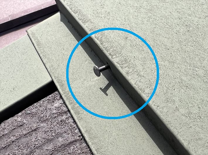 棟板金を固定する釘が浮いてきています。まず、棟板金とは屋根の棟部分(屋根の最上部や二つの屋根の接合部分)に使用される金属製の材料のことです。棟板金は屋根の上端を覆い雨水や他の天候から建物を守る役割を果たしております(^^♪