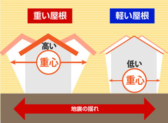 地震時の家屋の揺れはその重心位置に大きく左右されます。屋根が重いと必然的に重心位置も高くなってしまうため、不安定さも増します。そのため、揺れも大きくなってしまうのです。 また、実際の揺れでは先端になればなるほど遠心力が大きく働くため、重さの数倍以上の力が加わることになります。