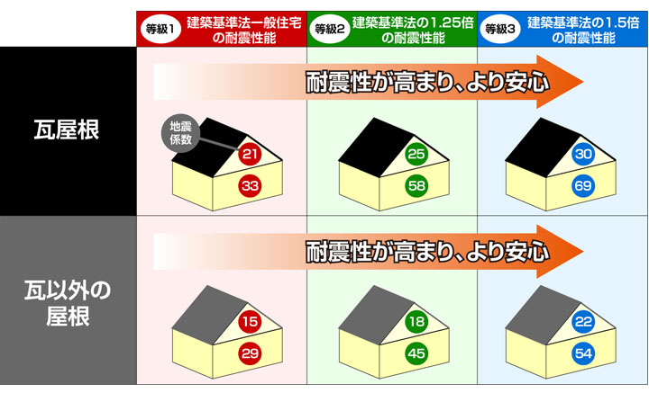 ※記載の地震係数は屋根の種類(瓦屋根もしくはそれ以外)によって各等級を取得するための数値です。