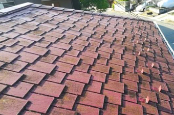 築15年、元々赤かったスレートはカビなどでくすんだ色になっていました。ところどころにひび割れも見られます。ひび割れは補修し、フッ素樹脂成分で耐久性の高いサーモアイFにて艶を取り戻しました。