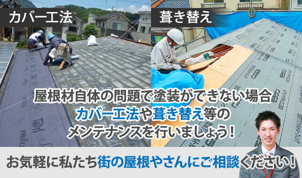 ●施工時期、製品によっては塗装が出来ない化粧スレートが存在します。これらは屋根材自体の問題ですので、屋根カバー工法・屋根葺き替え工事でメンテナンスを行いましょう。