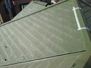 錆止めを塗布が終わったら、中塗りの工程です。お打ち合わせの段階では遮熱塗料も選択肢の一つでしたが、近いうちに屋根カバー工法か尾根葺き替えを検討するということなので、普通のシリコン塗料での塗り替えです。普通の塗料でも白を選択したら、どこまで涼しくなるかということを試してみたいということで、この色を選択なさりました。
