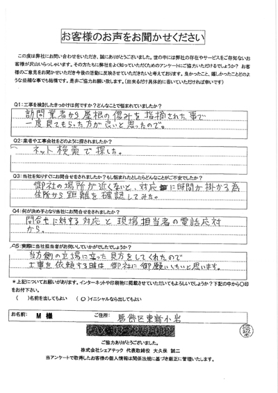 - トタン屋根が飛んでしまった、墨田区のK様のアンケート