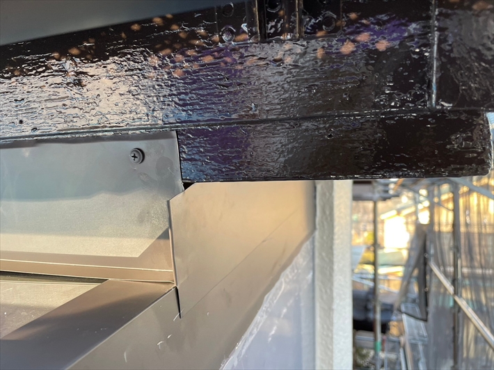 大屋根と立上りの取り合い部分は何重にも防水処理をしていますが、最後にコーキングを打って巻き込みを防ぎます。軒先部分は流れてきた雨水が回り込む可能性がありますので、コーキングを斜めに打つことでそのまま立上り側に流れる様になりますので、雨漏りの心配もなくなっています!