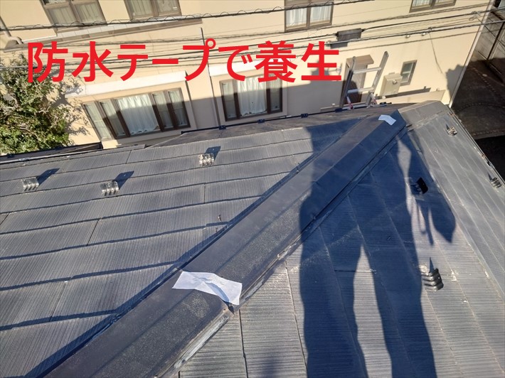 劣化している状況なのは間違いなく、外してしまうと雨漏りの危険性もありますので、工事までの間に不具合が出ない様に仮で養生しておきます。
