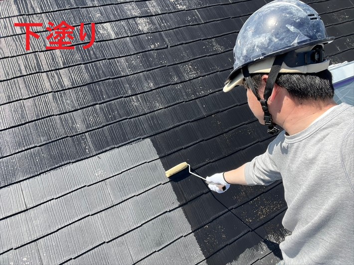 塗装工事は基本的に3回塗って仕上げるのですが、一番最初の塗装工事を下塗りといいます。塗装する面の傷みを保護し仕上げの塗料の付着性を高めるために必要です。仕上がると見えなくなる部分ですが、高圧洗浄と併せて塗装工事の中では非常に重要な工程になります。