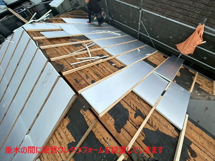 施工では、既存屋根材を撤去した後、垂木を新設し硬質ウレタンフォームを敷設。