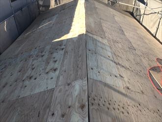 まずは屋根全体の瓦を全て降ろします。瓦降ろしの際にも感じましたが防水紙が全体的にボロボロな状態でした。50年耐えてくれてものすごく頑張ってくれた防水紙でした。瓦を全て降ろし終えたら新しく野地板を施工していきます。