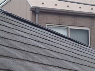 棟板金の調査で屋根に登ったので合わせて屋根の状態も確認してみます。M様邸では雨漏りを起こしているわけではありませんでしたが、前の塗装を行ったときに縁切り作業とサスペーサー挿入をしていないことが判明しました。この作業を省くと屋根材と屋根材の隙間が無くなり、中に入った雨水の逃げ道がなくなってしまい毛細管現象を起こしてしまいます。雨漏りの原因のひとつです。