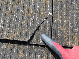 屋根が2面で形成される切り妻屋根なので風の影響を受けやすいのでしょう。棟板金の浮きが他のところにも見られました。これは推測なのですが強風の時、アンテナのケーブルも悪い影響を与えているような気がします。スレートの欠けが1箇所、見られました。