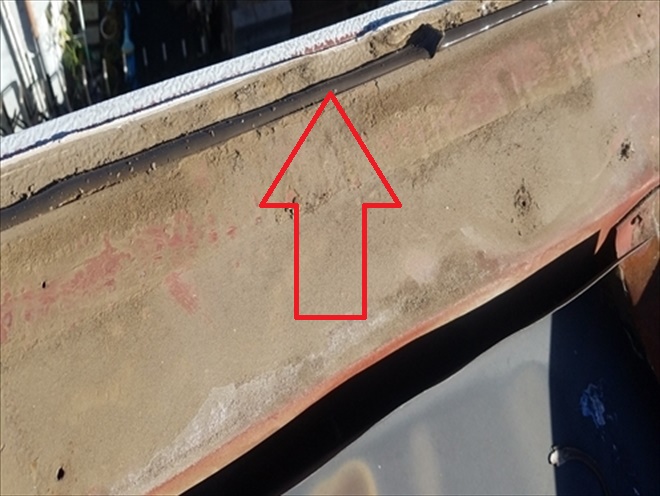 下地と外壁の取り合い部分にも隙間があいていました。笠木が飛ばされた事によって隙間から雨水が入り込んで雨漏りしてしまう危険があります。