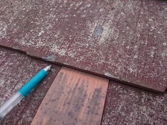 スレート葺き屋根には、ニチハのパミールが使用されていました。ノンアスベストのスレートで、製品に問題が有る為に剥離や割れが出てしまう屋根材です。ミルフィーユの様に何層にも剥離すると、雨水を吸い込んで更にボロボロになってしまいます。