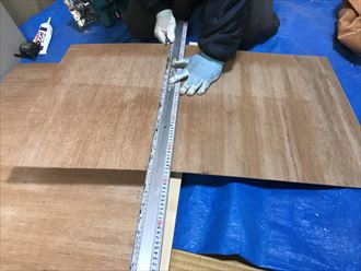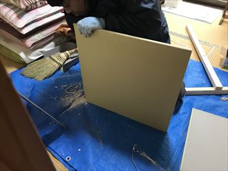 新しい天井材は石膏ボードです。開口部に合わせてサイズを調整し隙間の無い様ピッタリに取り付けて参ります。取り付けて行くとこの様な感じとなります。このままだと材料がそのまま剥き出しになっている状況となるので、ここにクロスを貼る等の処置が必要となります。今回は化粧ベニヤを取り付けて行く方法で施工致しました。