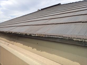 雨水は上から下へ流れて行きますので、雨水が多く通る谷部分や軒先部分に苔が発生しているのを発見しました。防水性の低下が原因により水分を好む苔・藻・カビが発生しています。