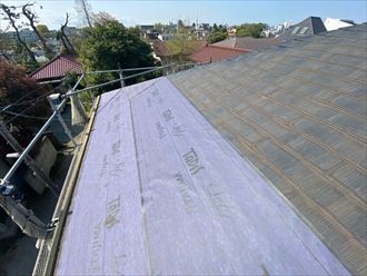 使用する防水紙は田島ルーフィング株式会社のタディスセルフになります。遅延粘着型の防水紙になりますので貼り付け直後には強く粘着せずに簡単に修正できますので施工性に優れた下葺材になります。貼り付けてから数時間後には強固な粘着力と防水効果を発揮しますので屋根カバー工事等の改修工事には最適な下葺材です。