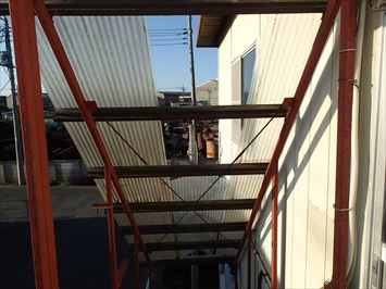 庇下地の鉄部が破損してした部分は新たに鉄材の下地で補強し波板貼り替え工事を行いました。ただ単に復旧するのではなく、プラスアルファの快適性を私たち「街の屋根やさん」では提案させていただいております。もちろん新型コロナウイルス拡散防止にも十分気を付けて作業を行っております。ご安心してお任せください。