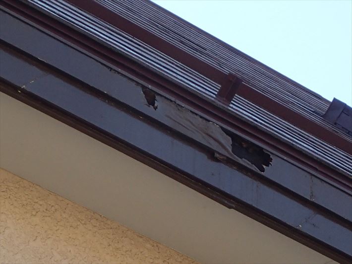 穴の開いた部分を近くで見ると、破風板の木部が腐食して穴があいてしまっているようでした。