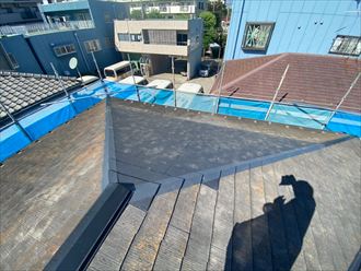これで天窓撤去閉鎖及びそれに伴う部分葺き替え工事の完成となります。やはり新品の屋根材と旧屋根材とでは色は異なるので、この様な見栄えとなります。ここまでで施工が終わるケースも有りますが、今回はこの後の工事として、屋根全体の塗装施工を実施して参ります。ですのでこの色の違いは塗装で当然解消される事となります。
