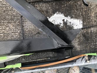 スレートの屋根材は勿論ですが、棟の部分や谷部分も当然塗装して有ります。タスペーサーがきちんと挿入されているのも見えます。これでしばらくこの塗装塗膜が雨や紫外線から屋根を守ってくれるでしょう。
