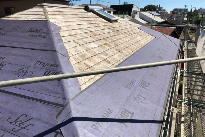 そして下葺き材、所謂防水シートの敷設作業となります。タジマのタディスセルフと言う材料で先程来申し上げている粘着式のタイプの防水シートです。洗浄作業で屋根の汚れを落として綺麗にした事も有り、しっかりと密着して問題なく作業の方も進められました。