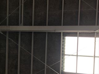 こちらが雨漏りの状況となります。ブルーのプラ板で水受けを設置している上部からの雨漏りです。位置的には明り取りの有る箇所の上側付近となります。この様な明り取りを設置している箇所が原因で雨漏りとなるケースも有りますが、その他の箇所については雨漏りを来たしている様子は無いので、原因については屋根の状況次第となります。