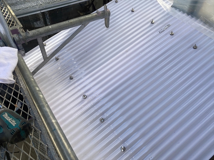 鉄骨製のフレームには不具合は出ておりませんでしたので、波板だけの交換工事です。元々は塩化ビニル製の波板が張られていて、経年によって耐久性が落ちてしまい割れなどに繋がっていました。張り替えるのはポリカーボネート製の波板です。