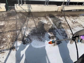 それでは工事の様子に移ります。まず歩行用の保護マットが敷いておりましたので、マットを撤去して高圧洗浄をかけていきます。