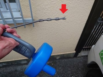 ワイヤーを伸ばしていきハンドルを回すことで先が回転しますので詰まった部分をえぐっていきます。水を流しながらおこなう事で詰まりを解消する事が出来ます。