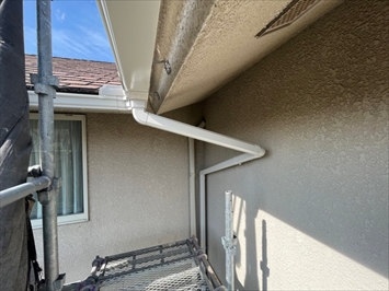 径の大きな雨樋に交換いたしましたのでオーバーフローは起きにくくなったかと思います。雨樋の主原料である塩化ビニルは紫外線によって劣化してしまいますので外壁塗装と同じタイミングで塗装を行ってあげるとベストです。
